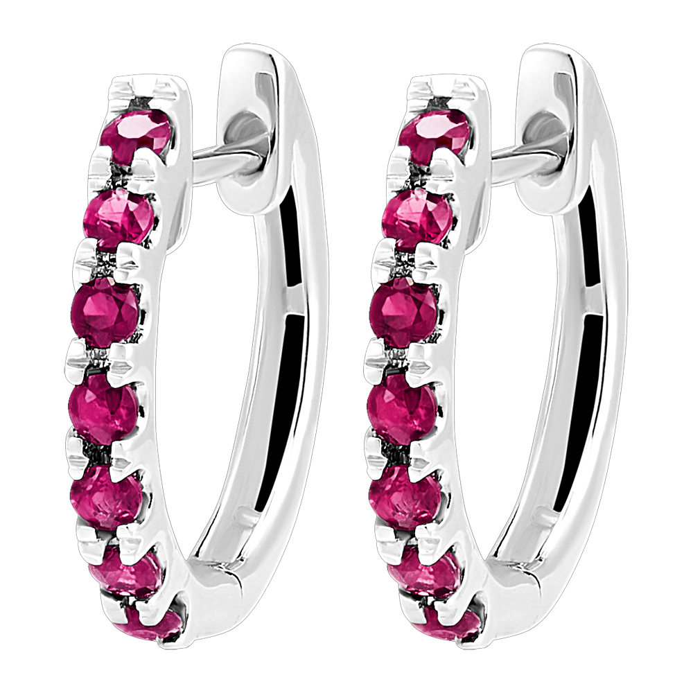 Descoperiți o pereche delicată de creole din aur alb de 18 carate, semi pavate cu 14 rubine strălucitoare.