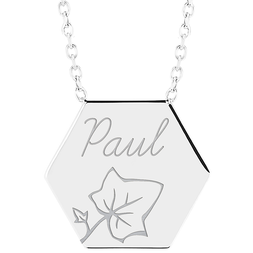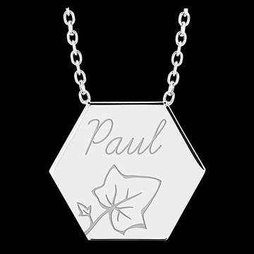 Acest colier din aur alb de 9 carate se remarcă prin medalionul hexagonal gravat fin cu motivul Edenly.