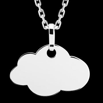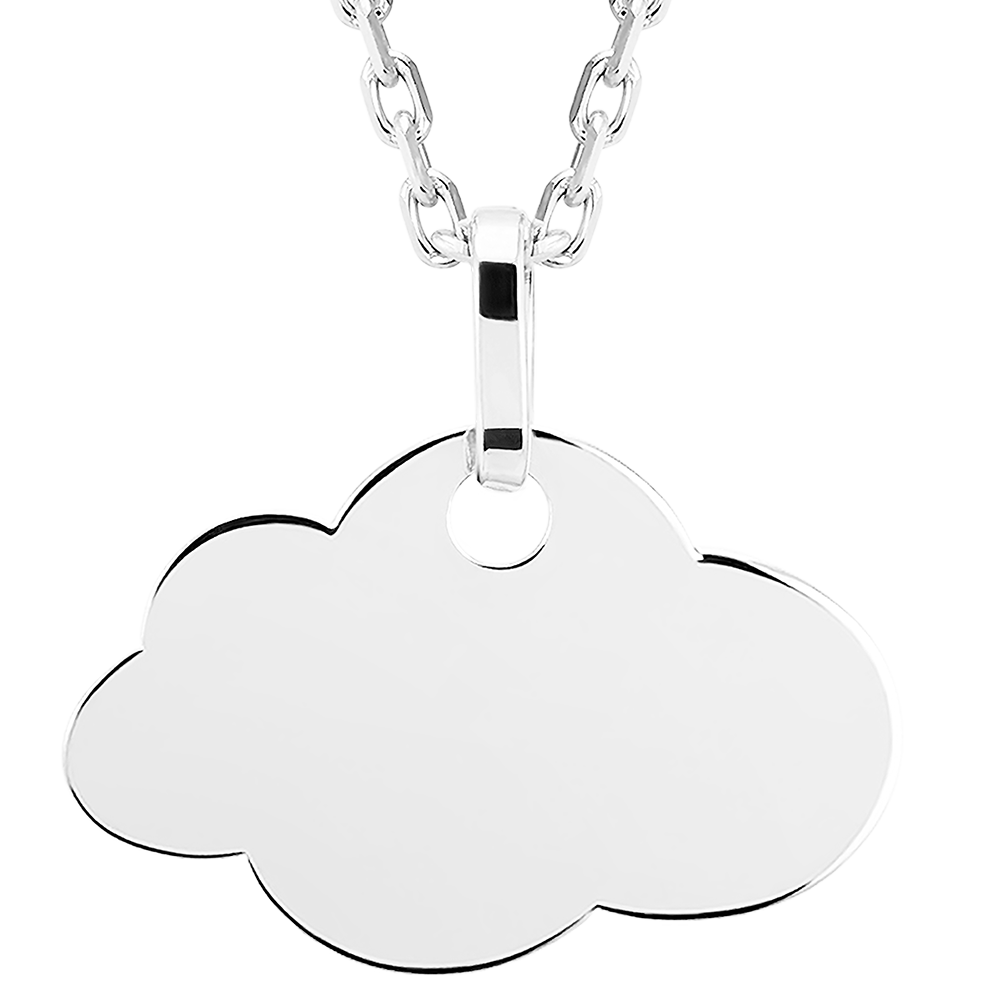 Acest pandantiv din aur alb de 9 carate se remarcă prin simplitatea și eleganța sa, având o formă delicată de nor. Este conceput pentru a fi personalizat prin gravură.
