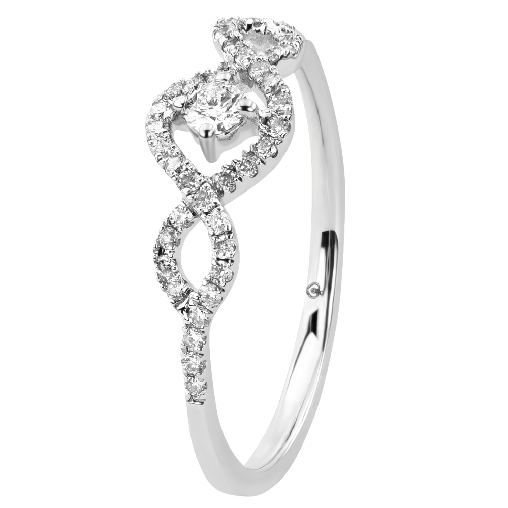Un diamant, piatra centrală, îmbrăţişat de spirale încrustate cu diamante, într-un model amprentă a feminităţii şi a delicateţii.