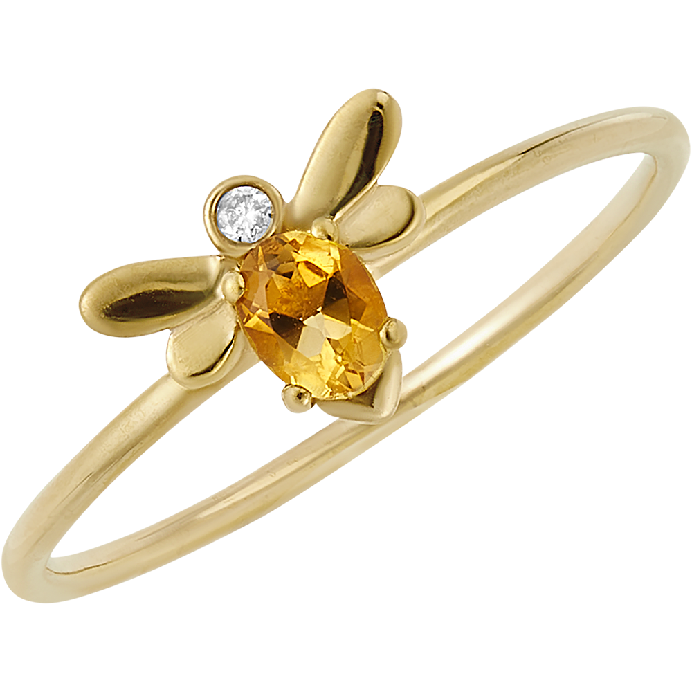 Inelul Albină Pop din aur galben o reprezintă pe regina albinelor, o albină așezată delicat pe un inel din aur galben, ce conține un citrin oval de 4 x 3 mm și un diamant de laborator.