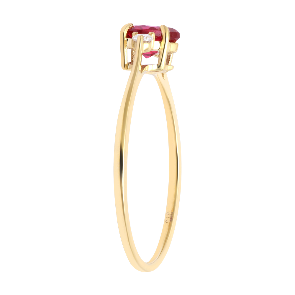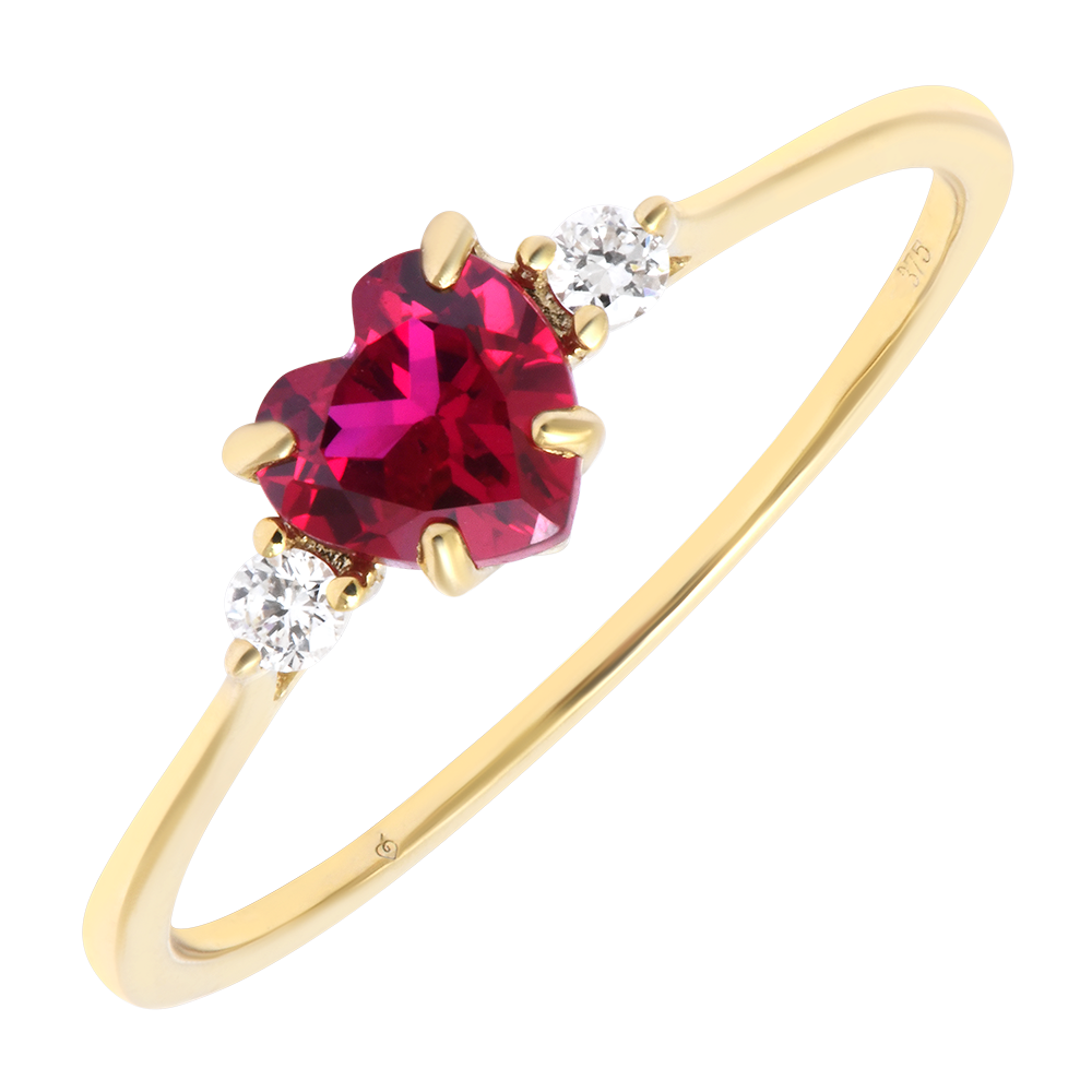 Un rubin sintetic în formă de inimă, flancat de doi diamante sintetice strălucitoare, împodobește acest inel subțire din aur galben 9 carate.