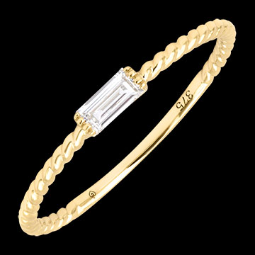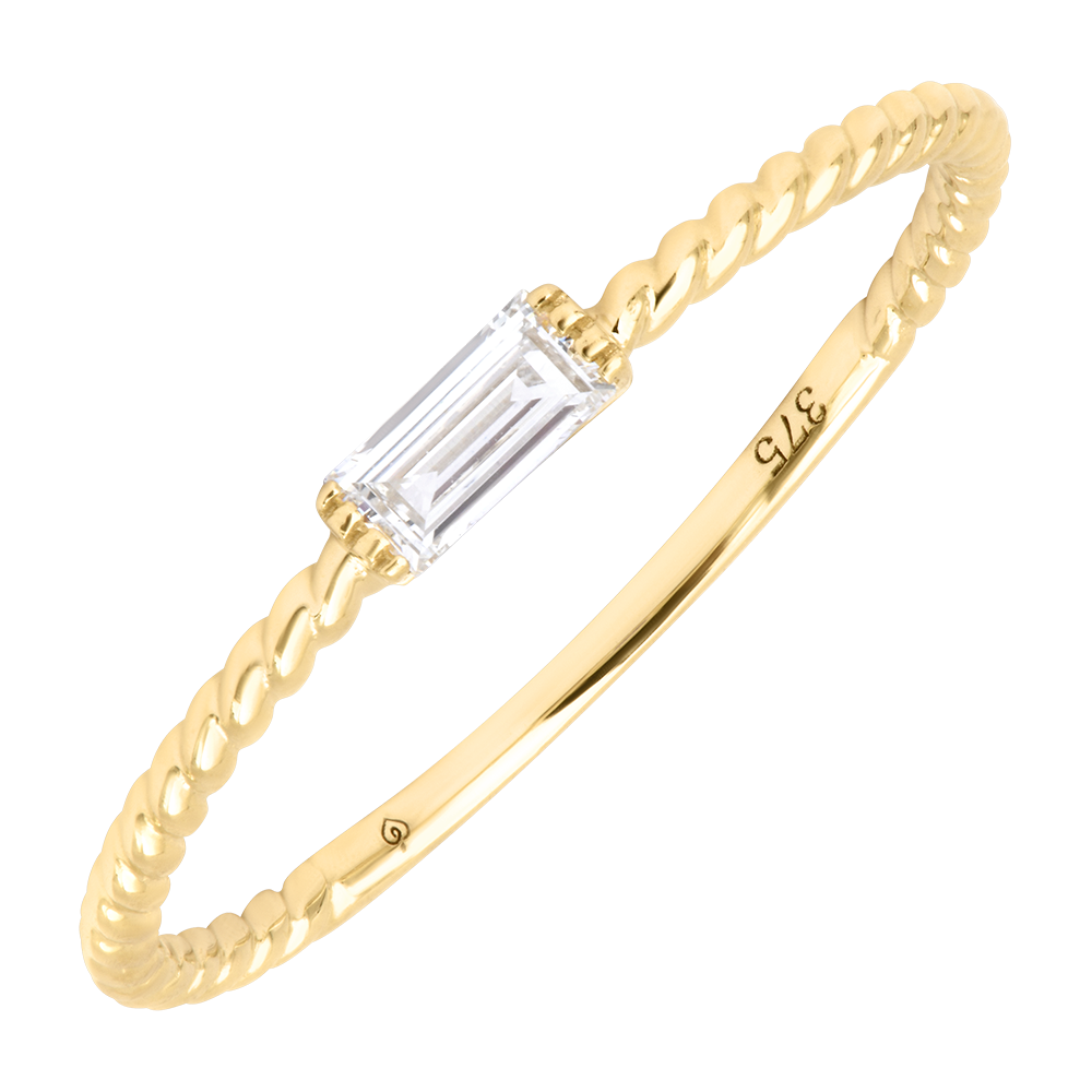 Un diamant sintetic tăiat dreptunghiular, montat pe un inel răsucit cu finețe.Un inel rafinat și elegant, perfect pentru un strop de strălucire în fiecare zi.