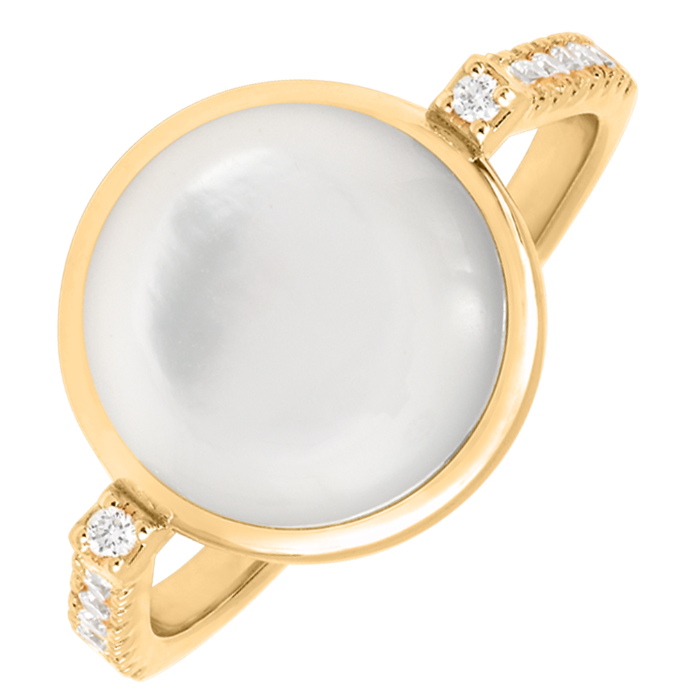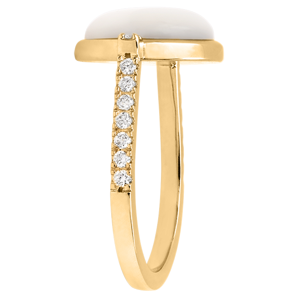 Elegant și luminos, inelul Cabochon Aura Nacrée combină finețea unui cabochon din sidef alb cu strălucirea diamantelor montate în aur. Designul său simplu evidențiază piatra centrală, adăugând o notă modernă și rafinată. Se poartă singur sau împreună cu verighetele Contour – netede sau cu diamante – pentru a crea trio-ul Romance Moderne, o îmbinare perfectă între minimalism și feminitate.