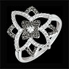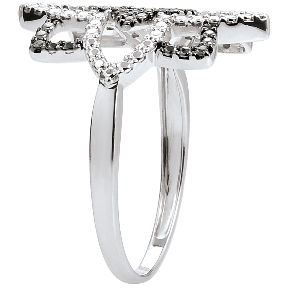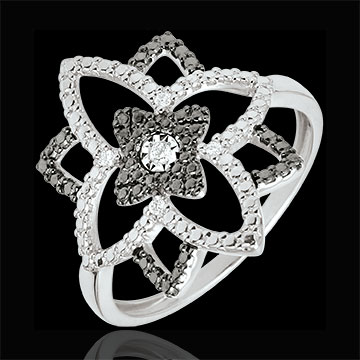 Inel Clar Obscur floare din aur alb aerisită, ale cărei petale lucrate stil diamant precum şi alternanţa de negru şi alb dau acestei bijuterii originale întregul său relief.