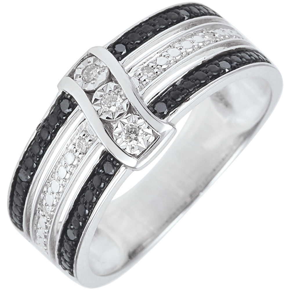 Trei sublime diamante încrustate în aurul alb lucrat stil diamant, pentru un maxim de strălucire, ceea ce formează însă baza acestui Inel Clar Obscur sunt cele 3 inele de asemenea încrustate de diamante negre.