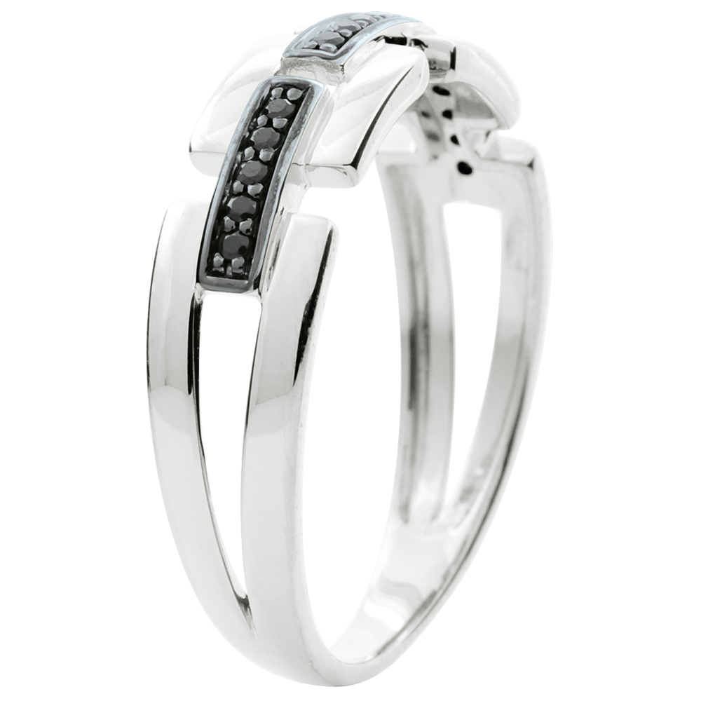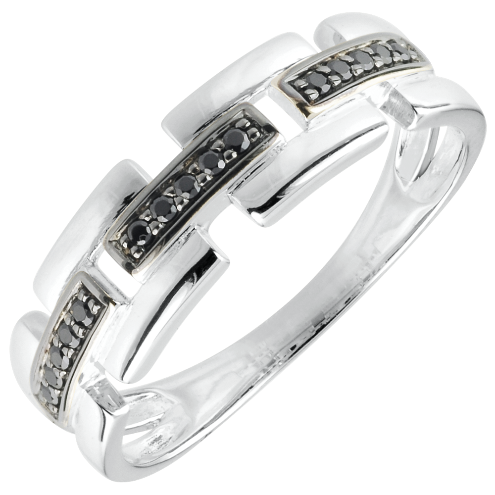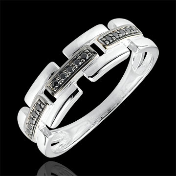 Două linii de aur punctate separate de linii de diamante negre. Un inel Clar Obscur modern şi feminin.