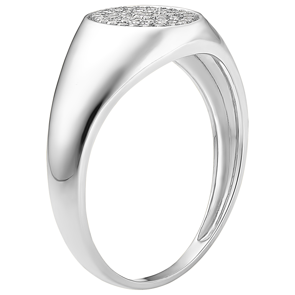 Acest inel sigiliu pentru bărbați, realizat din aur alb de 9 carate, are o placă ovală bogat pavată cu 50 de diamante albe, cu o greutate totală de 0,17 carate.