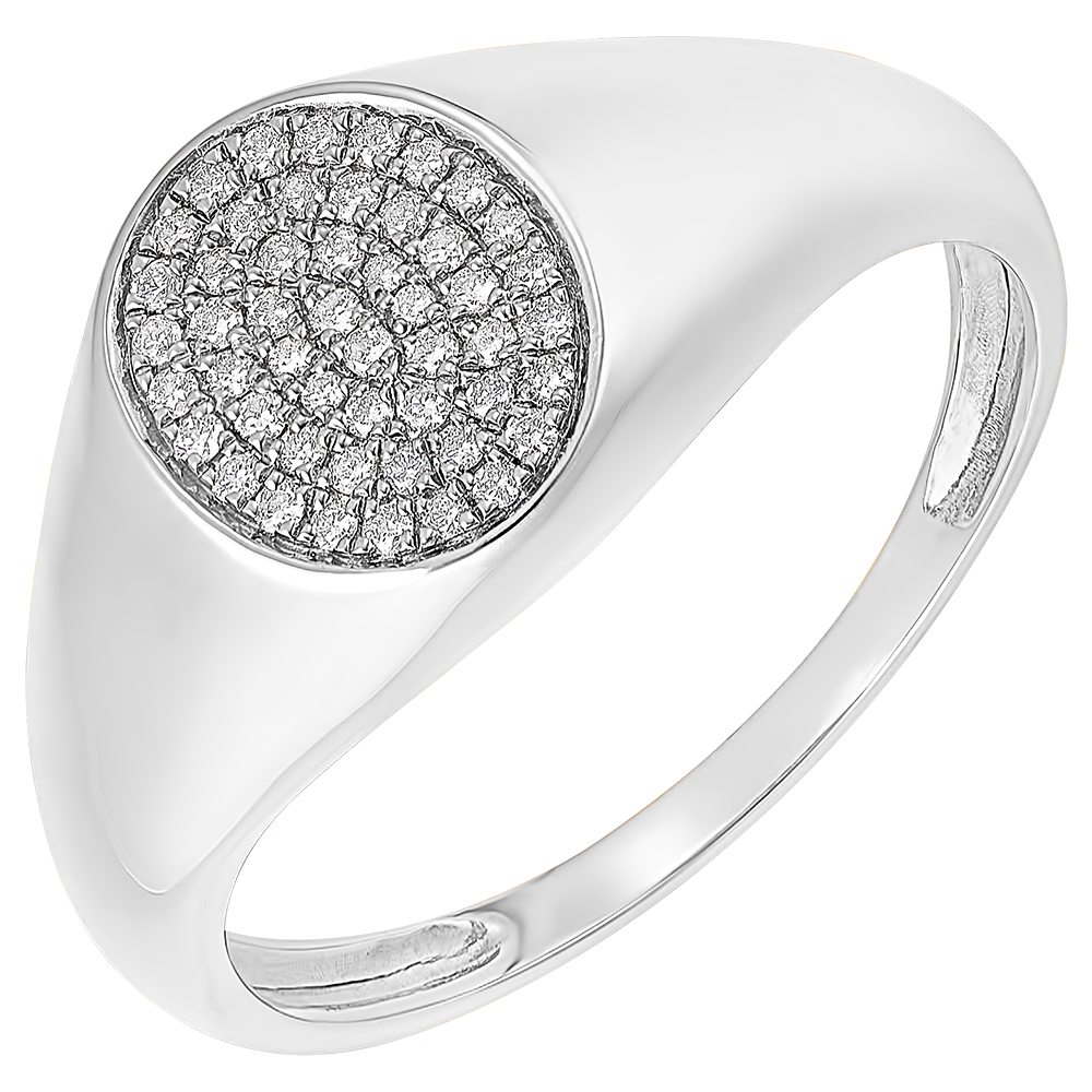 Un inel cu sigiliu din aur alb a cărui placă ovală este bogat încrustată cu 50 de diamante.