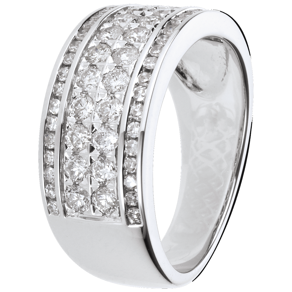 Eleganţa sublimă a unui inel cu patru şiruri de diamante încrustate în aur alb ale căror dimensiuni diferite îl face sofisticat.