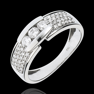 O trilogie de diamante încrustate cu atenţie între două barete din aur alb pe o montură pavată cu eleganţă.