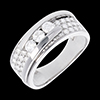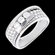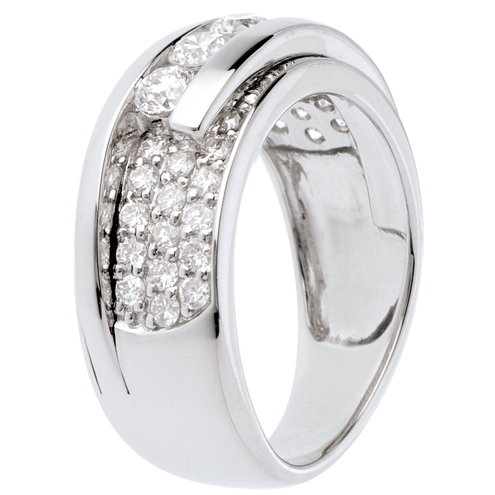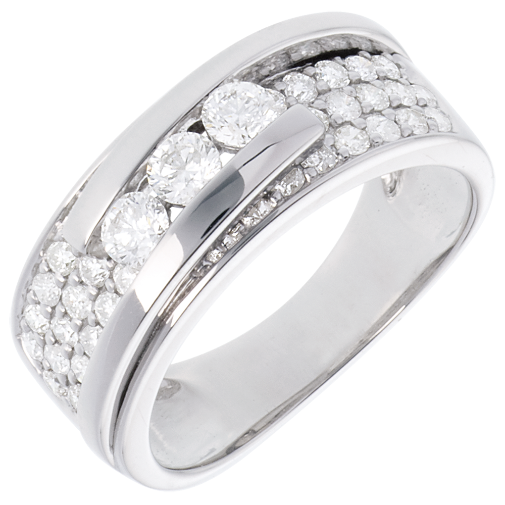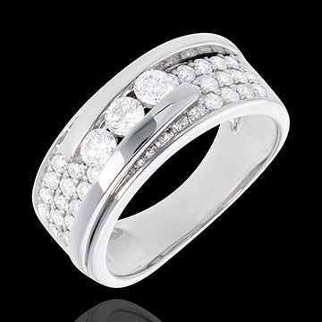 O montură pavată subliniată de un inel dublu uşor întredeschis asupra unei trilogii de diamante, pentru un inel de excepţie.