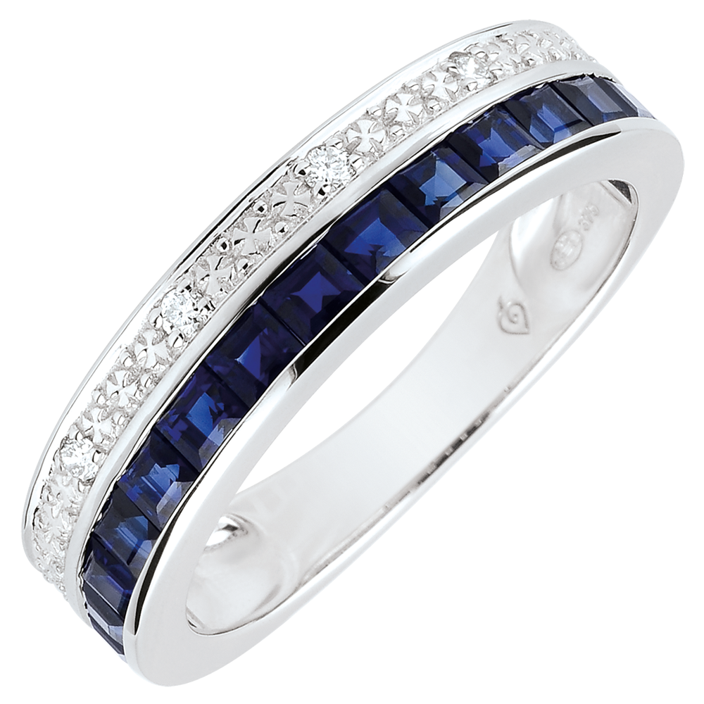 Un inel elegant din aur alb al cărui pavaj central de safire albastre este subliniat de un şir de diamante şi flori de aur.