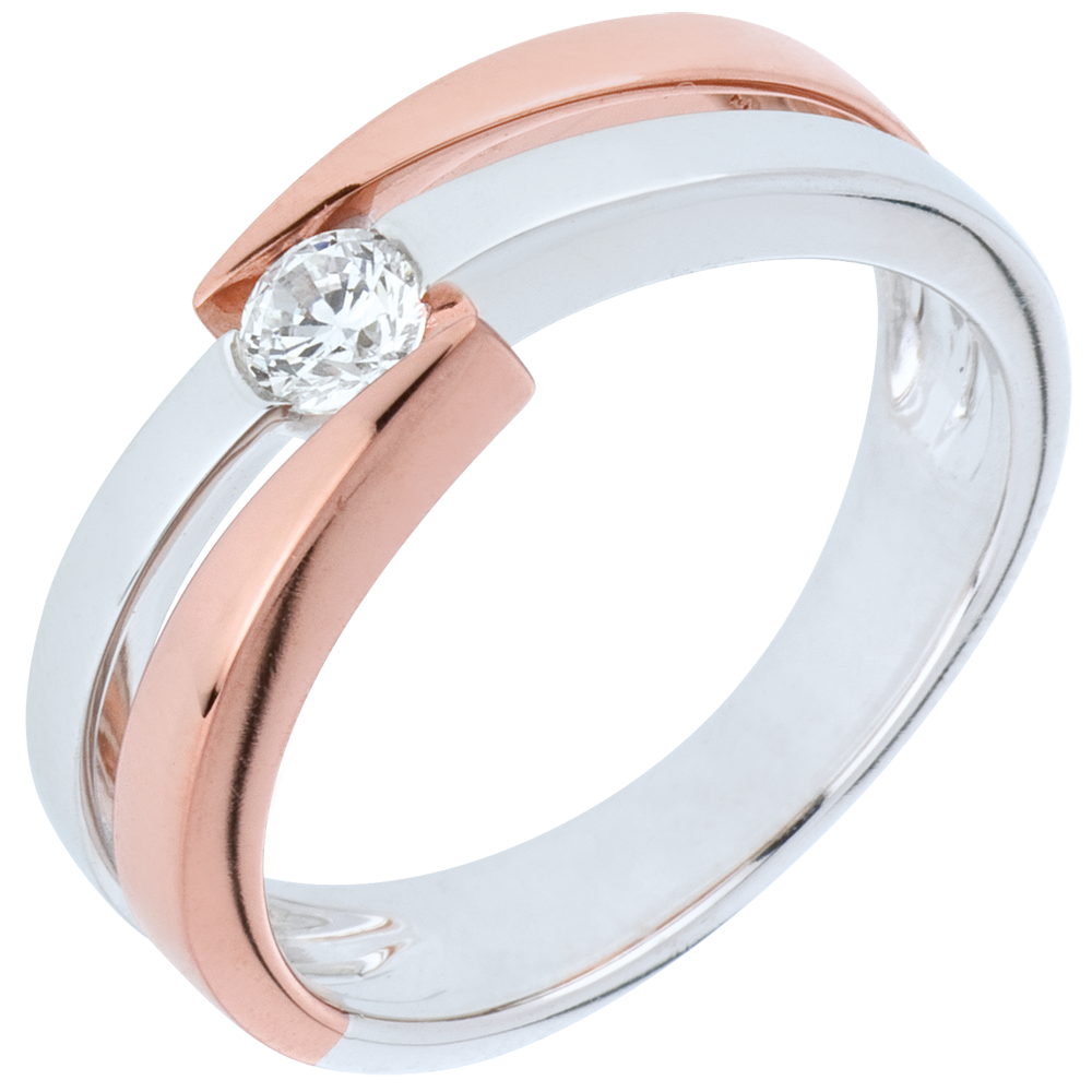 Un diamant solitaire încrustat într-un inel de aur alb ţinut între două braţe de aur roz.