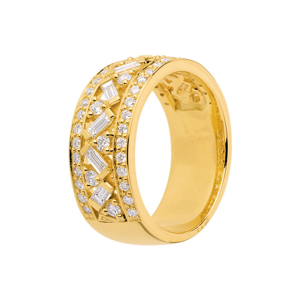 Graţia imperială a unei monturi încoronată de diamante rotunde sau cu tăietură baghetă.