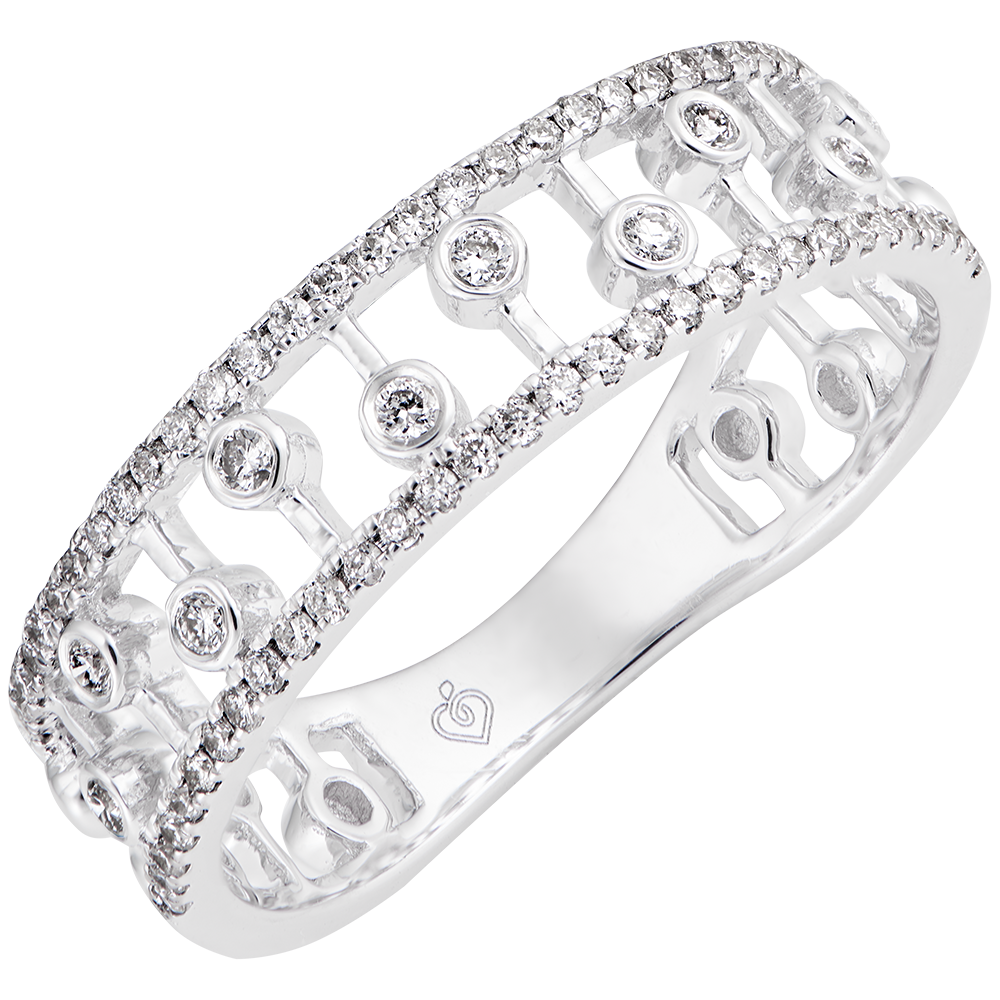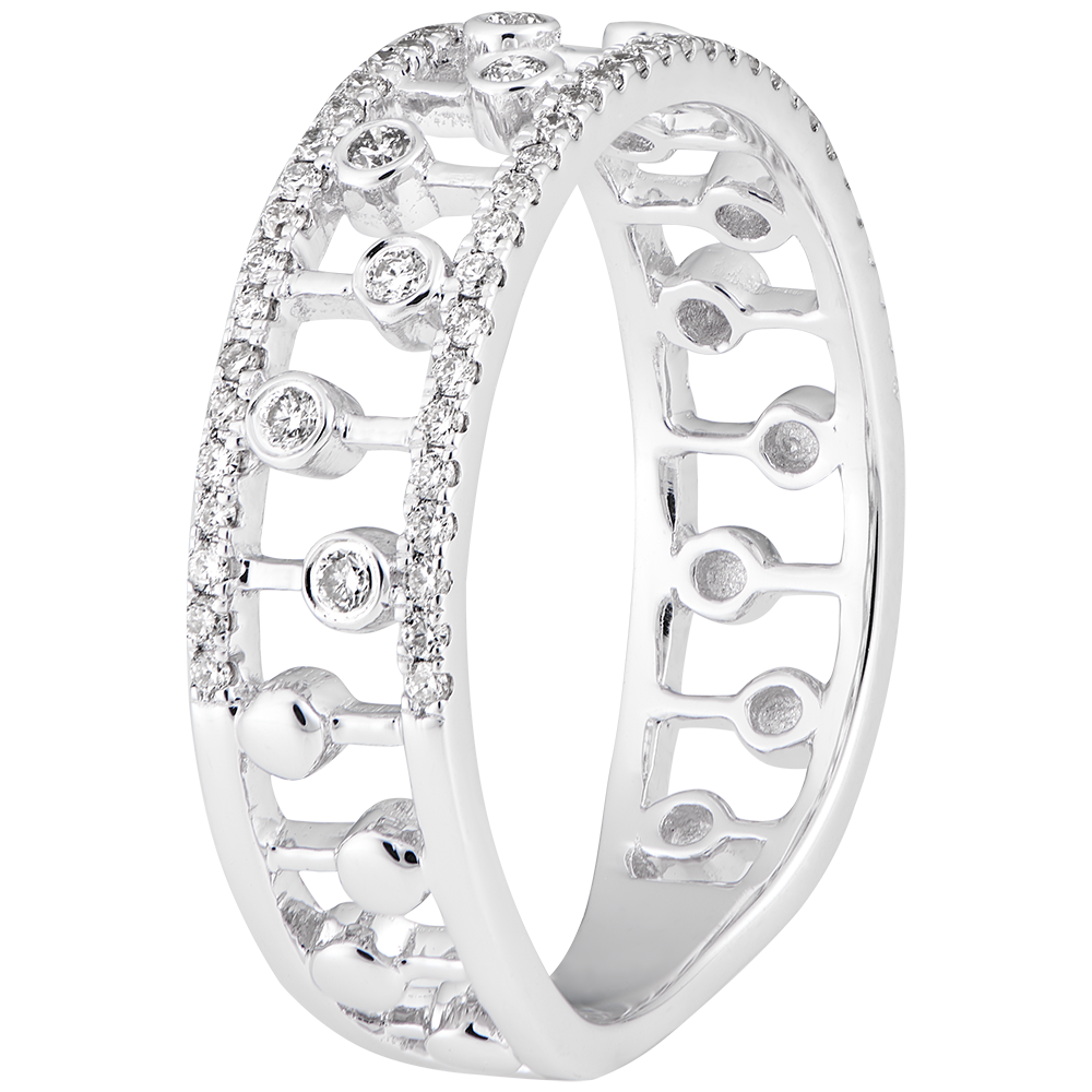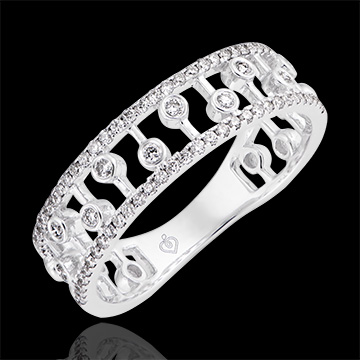 Un inel care îmbină perle de diamant asemeni unei țesături, între două inele pavate. Un model original și delicat.