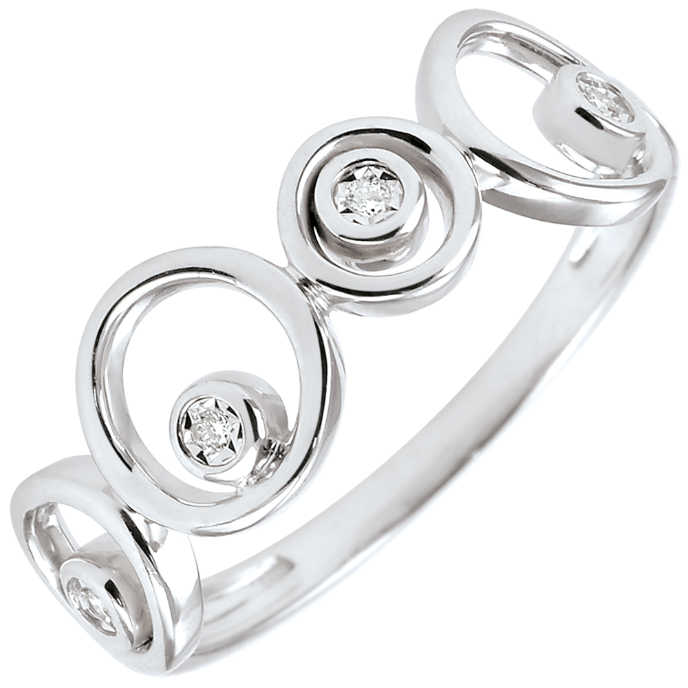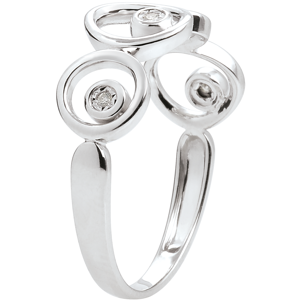 Un inel din din aur alb şi diamante în valuri voluptoase plin de blândeţe .