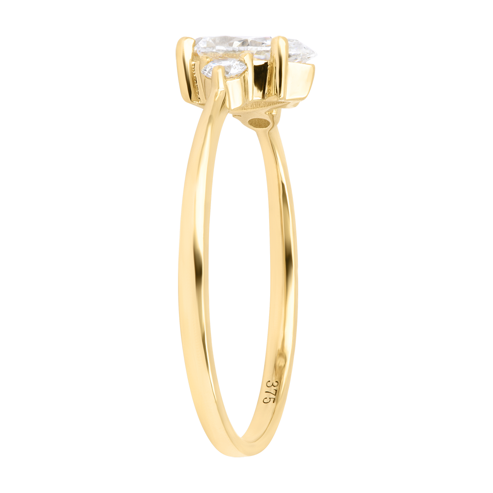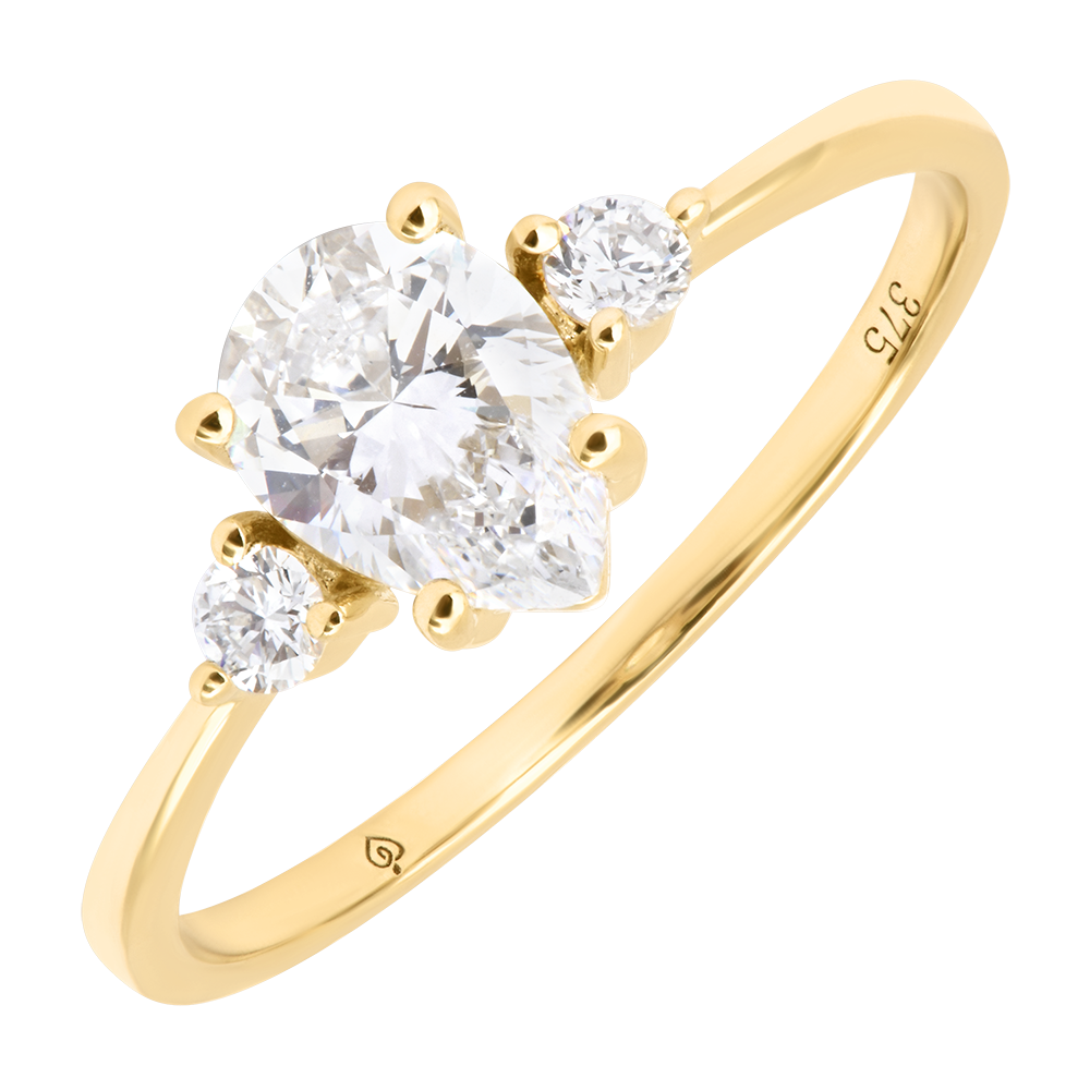 Un diamant sintetic tăiat în formă de pară, de 0,5 carate, este însoțit de două diamante rotunde strălucitoare. Acest inel din aur galben de 9 karate oferă un design luminos și echilibrat.