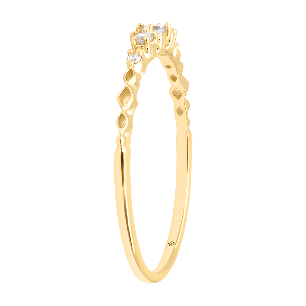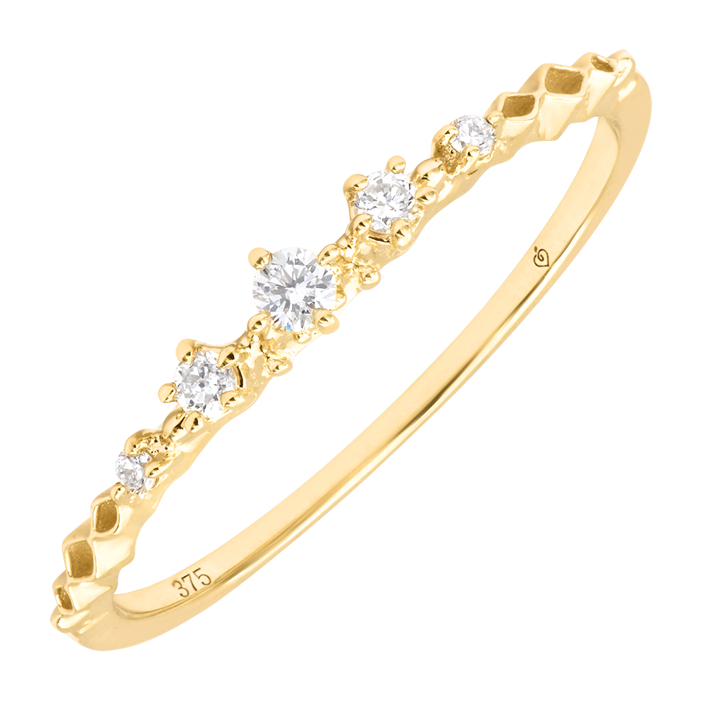 Cinci diamante montate cu delicatețe strălucesc pe inel, între accente luminoase și detalii fine, sculptate cu grijă.O bijuterie grațioasă și subtilă, perfectă pentru a aduce rafinament în fiecare zi.