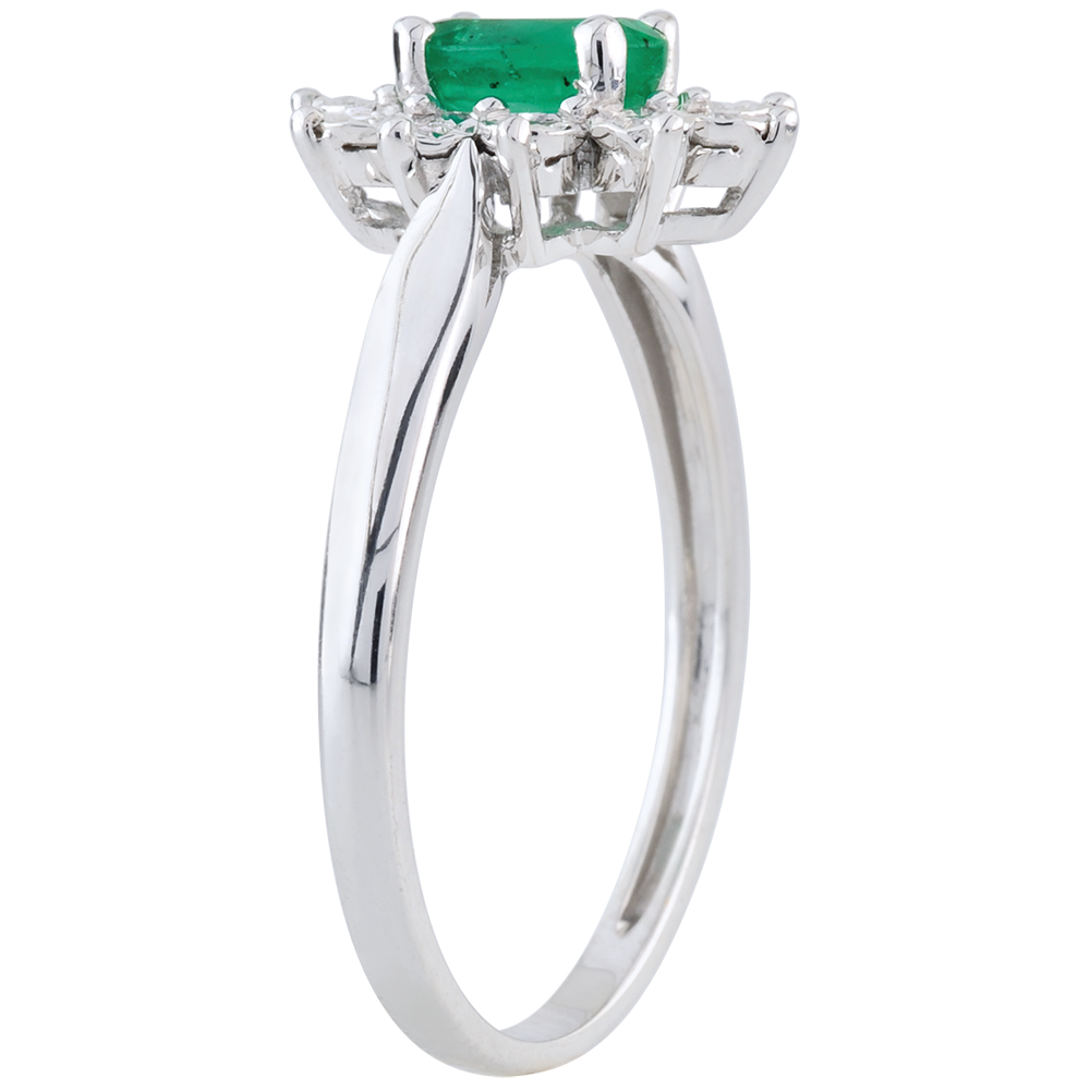 Un smarald oval în centrul unei anemone din aur alb ale cărei petale sunt încrustate cu diamante.