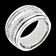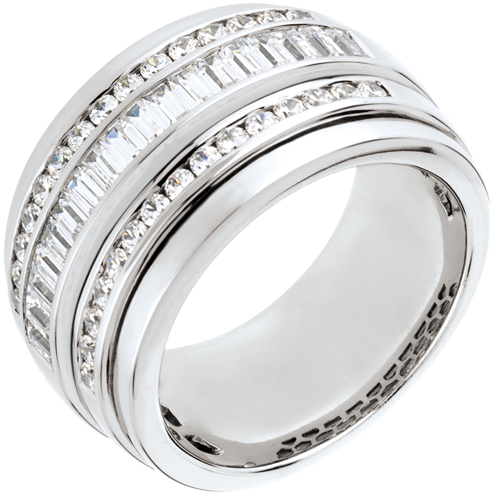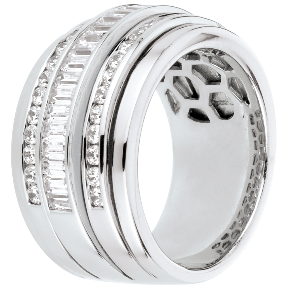 Un inel lat compus dintr-un şir de 18 diamante tăiate baghetă înconjurat de două rânduri de diamante briliant, pentru a crea o geometrie şi o strălucire perfecte.