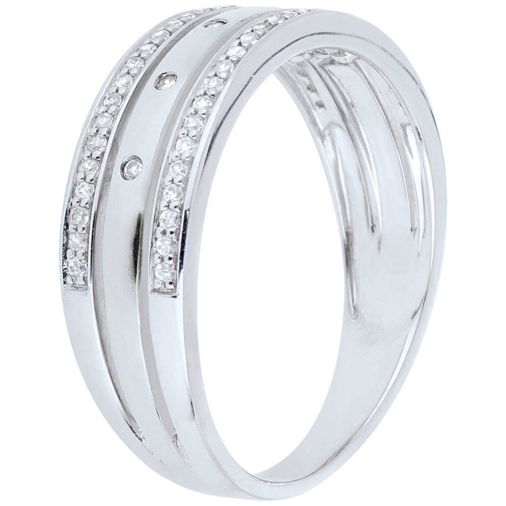Două inele de aur alb pavate de briliante încadrează un inel central de aur îmbrăcat cu cinci diamante.