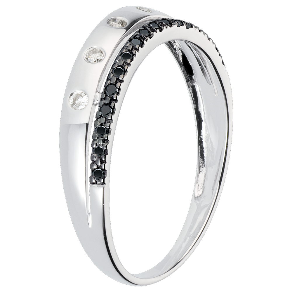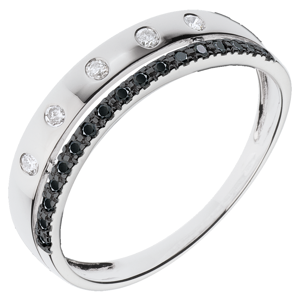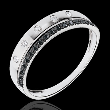O verighetă de aur alb încrustată cu diamante asemănătoare stelelor este încoronată de un inel pavat cu diamante negre.