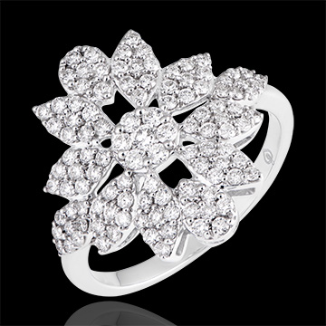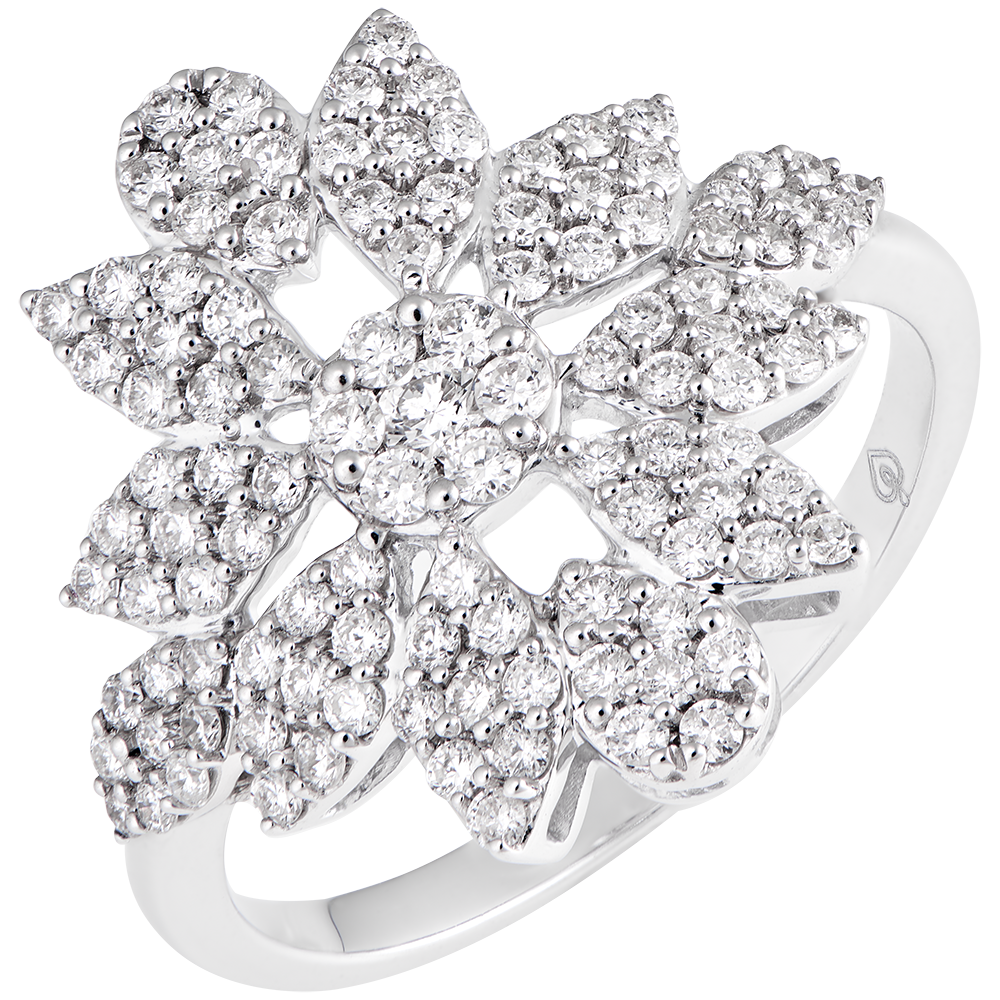 Un motiv floral regândit într-un stil imperial și prețios definește acest inel grafic cu petale pavate. Un model statutar și maiestuos pentru o bijuterie aproape fermecată.