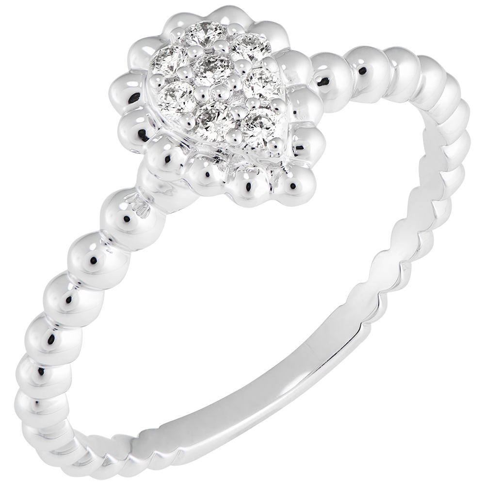 Un cluster de diamante fixat pe o montură perlată, într-un inel blând și delicat