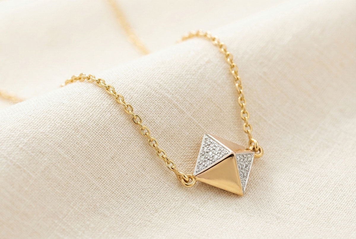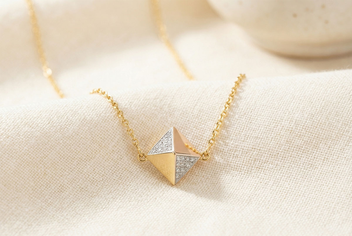 Forma de octaedru a diamantului brut este înconjurată de aur şi de pavaje de diamante ce aduc omagiu formei brute şi originale. Lungime: 42cm cu o prelungire de 3cm.