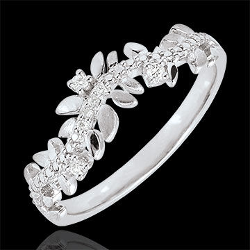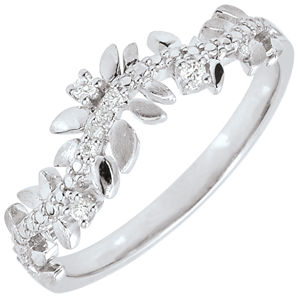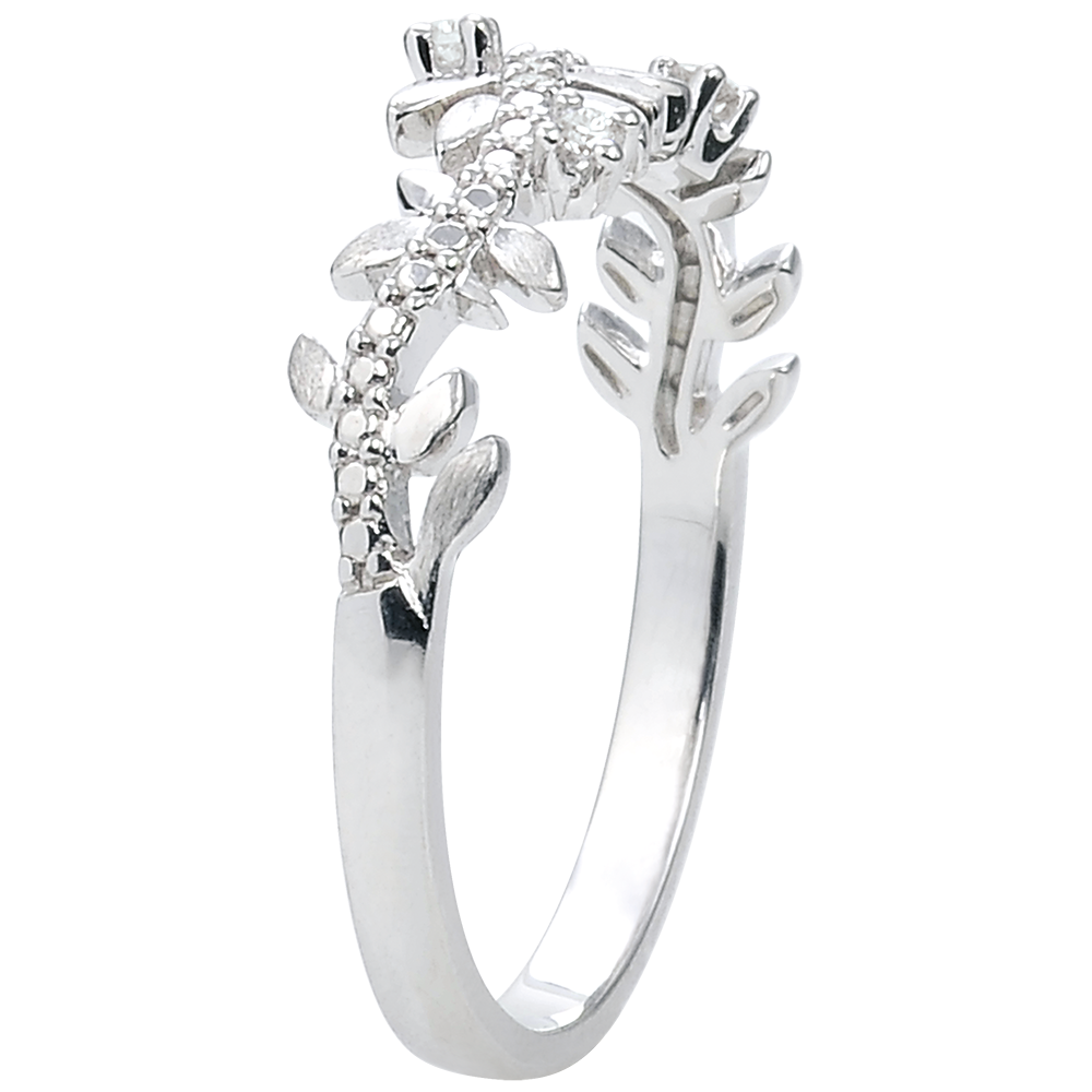 O alternanţă de frunze de aur alb strălucitoare şi de frunze cu lustru periat manual într-un inel romantic încrustat cu 7 diamante.