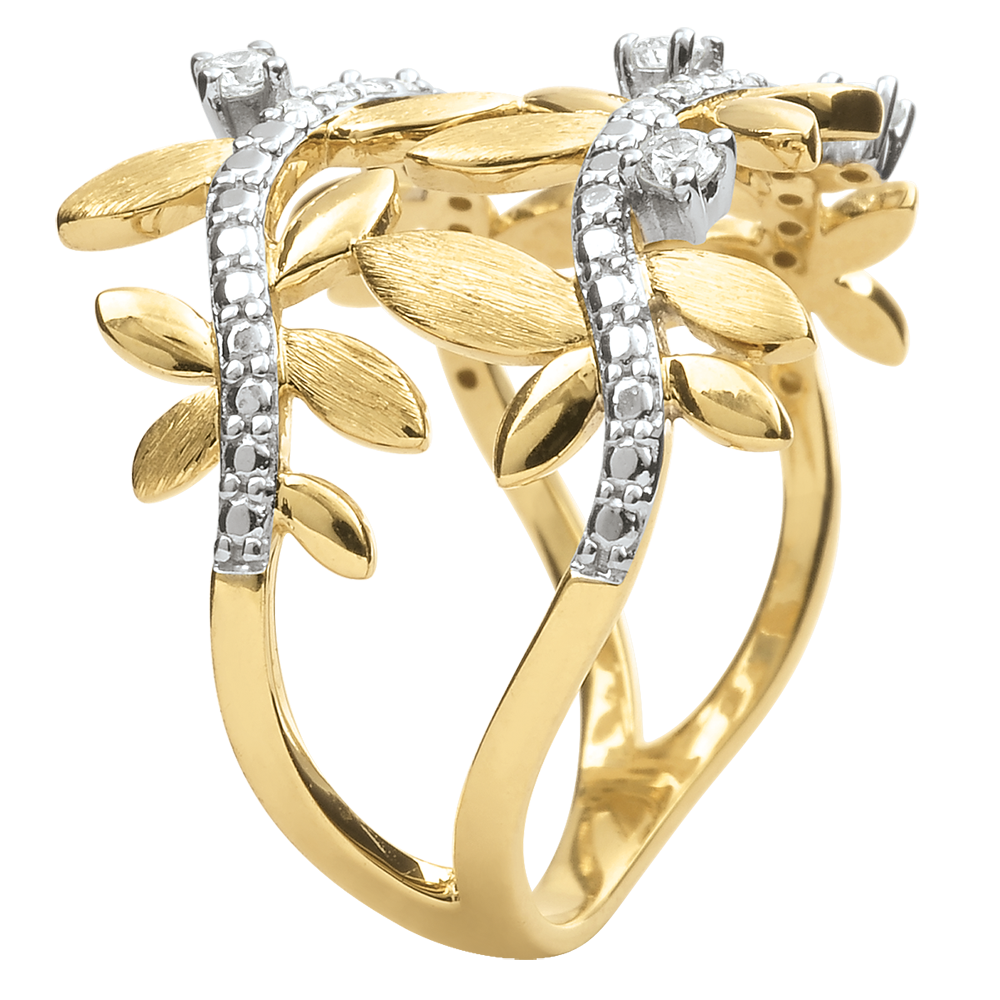 O alternanţă de frunze de aur strălucitoare şi de frunze cu lustru periat manual într-un inel romantic de aur galben încrustat cu 13 diamante.