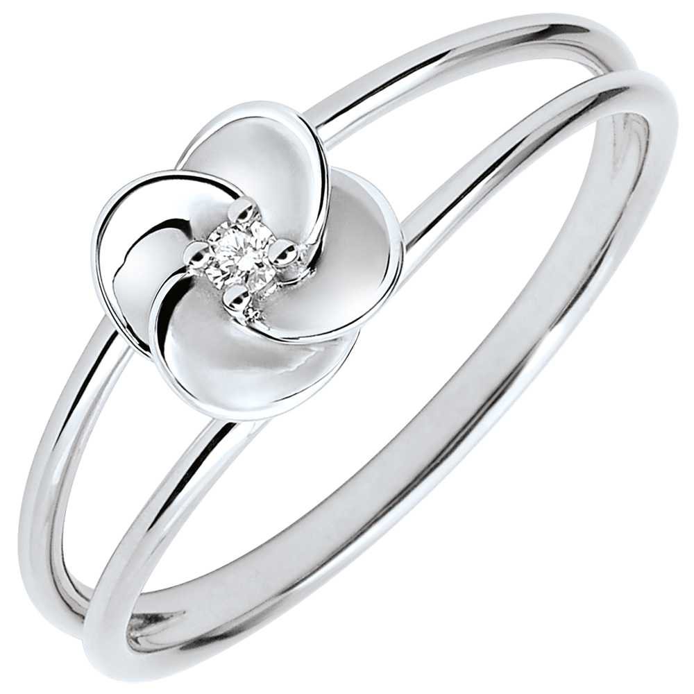 Petalele acestui trandafir delicat din aur alb sunt deschise spre o inimă de diamant pentru eternitate. Modern şi romantic, un cerc dublu de aur ţine preţioasa floare.