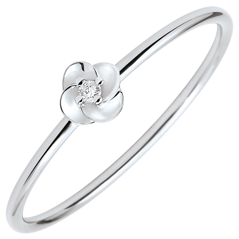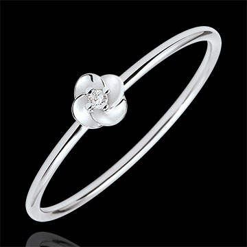 Petalele acestui trandafir mic şi delicat din aur alb sunt deschise spre o inimă de diamant pentru eternitate.
