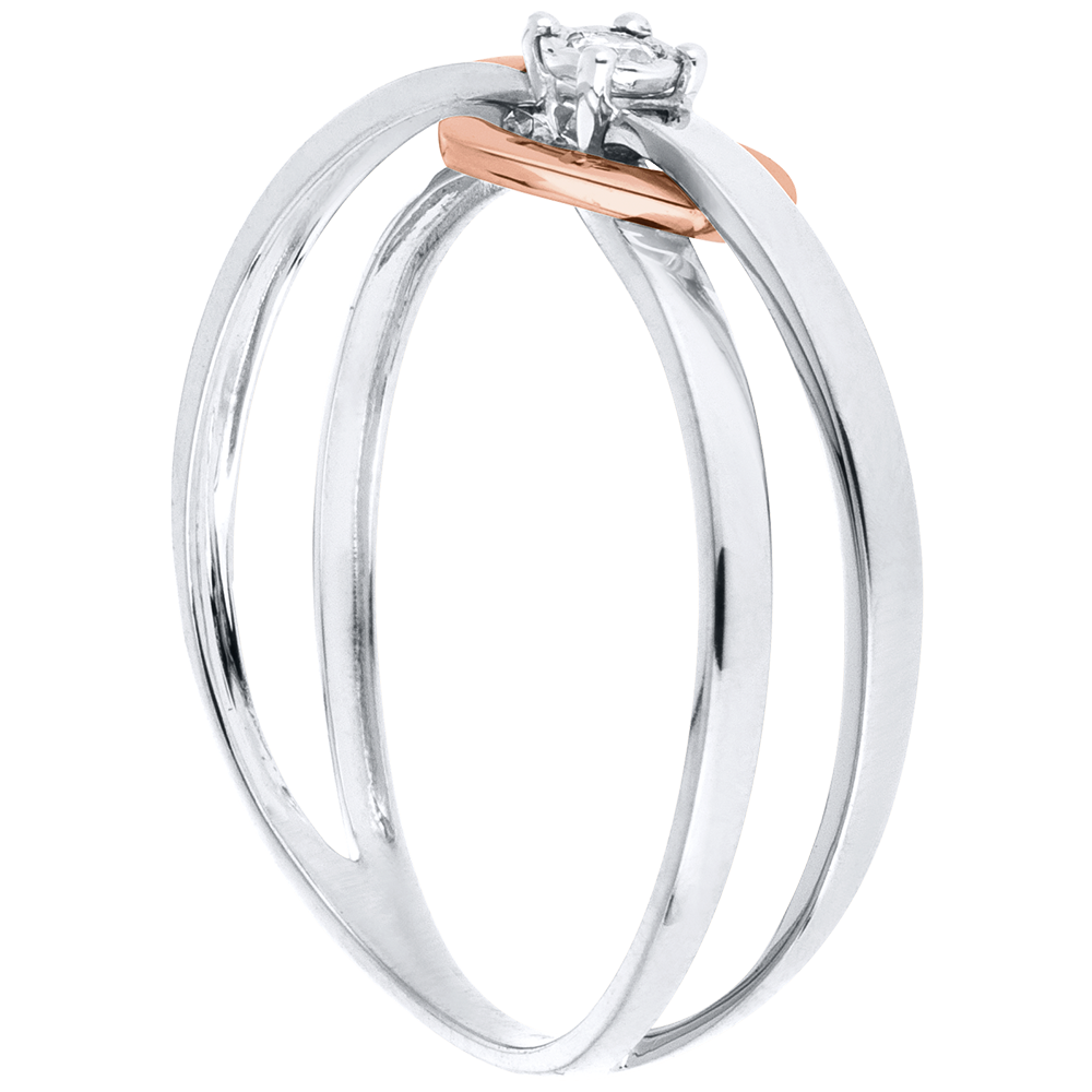 O inimă din aur roz ţinută în echilibru de două inele din aur alb deasupra căreia este fixat un diamant încrustat în aur alb.