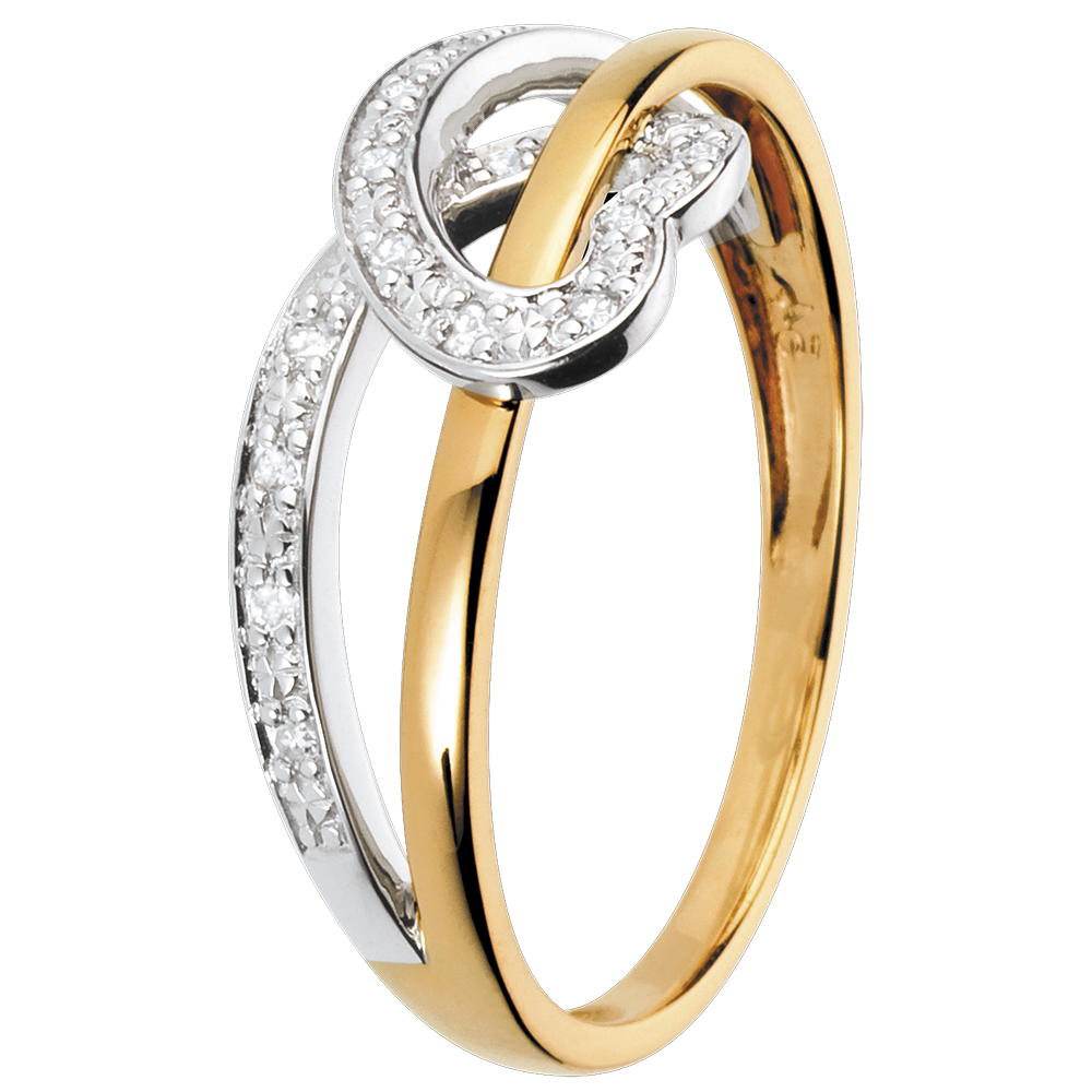 O panglică de aur alb pavată cu diamante ia uşor forma unei inimi ce se agaţă de un inel din aur galben.