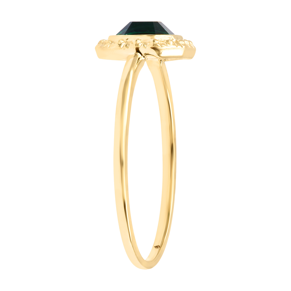 Un smarald sintetic de 0,6 carate este încadrat în centrul acestui inel rafinat din aur galben de 9 carate, înconjurat de un delicat motiv floral în relief.