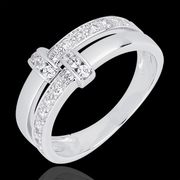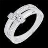 Două inele de aur alb semi pavate unite de o legătură de aur alb pavată cu briliante.
