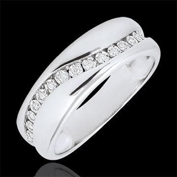 Un inel din aur alb străbătut de o curbă armonioasă pe care domină 15 diamante. Acest inel poate fi purtat ca verighetă modernă sau ca inel de excepţie.