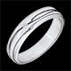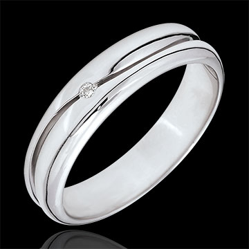 Un inel lat din aur alb este traversat de un val ce îl separă în două părţi. În centrul lui domină un diamant. O verighetă pentru domni şi doamne.