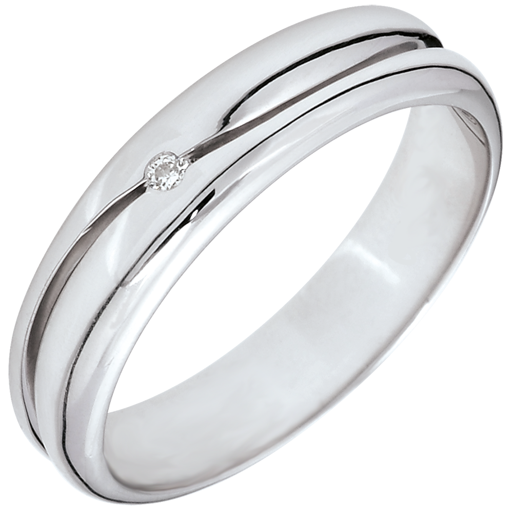 Un inel lat din aur alb este traversat de un val ce îl separă în două părţi. În centrul lui domină un diamant. O verighetă pentru domni şi doamne.