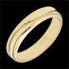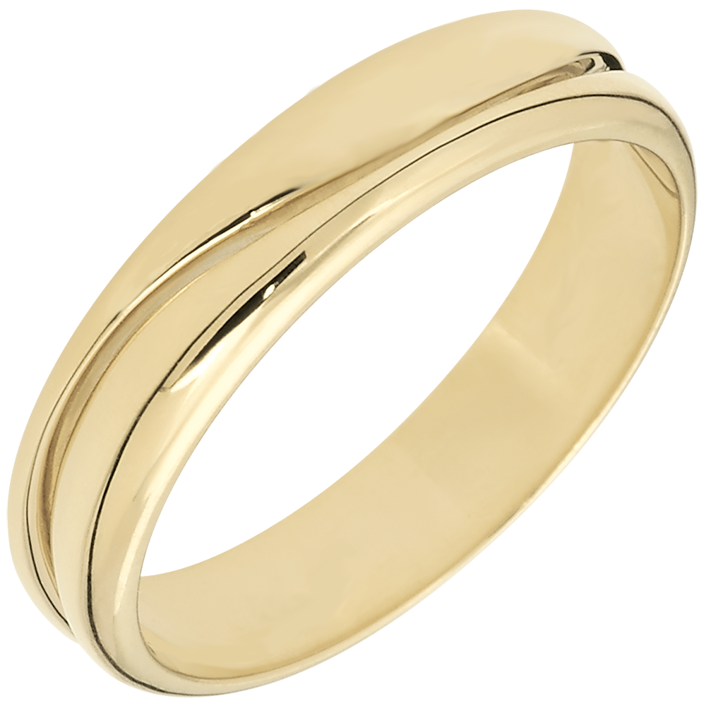 Un inel lat din aur galben este traversat de un val ce îl separă în două părţi. O verighetă pentru domni şi doamne.
