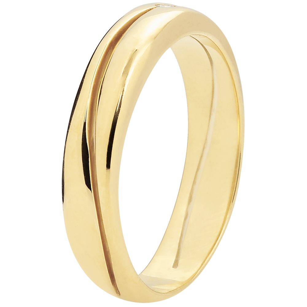 Un inel lat din aur galben este traversat de un val ce îl separă în două părţi. În centrul lui domină un diamant. Verighetă mixtă.