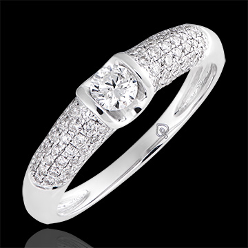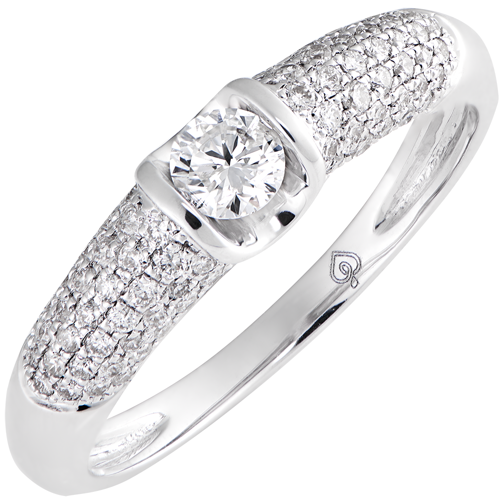 Sacrul unui diamant subliniat de un pavaj generos încrustat pe cele 3 inele ale monturii. Un inel de logodnă de-a dreptul strălucitor.