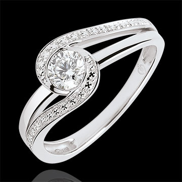 Un diamant solitaire susţinut într-o mişcare de aur alb neted este sărutat şi ţinut cu pasiune de o curbă dublă de aur lucrat stil diamant.