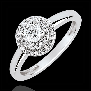 Cu o eleganţă atemporală, acest inel de logodnă scoate în evidenţă un diamant tăiat briliant fixat într-un şir dublu de diamante. Lux şi romantism pentru această centură de diamante.