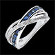Trei inele sofisticate de aur alb, al căror pavaj central de safire albastre se îmbină cu un inel încrustat cu diamante şi cu un alt inel în întregime din aur alb.