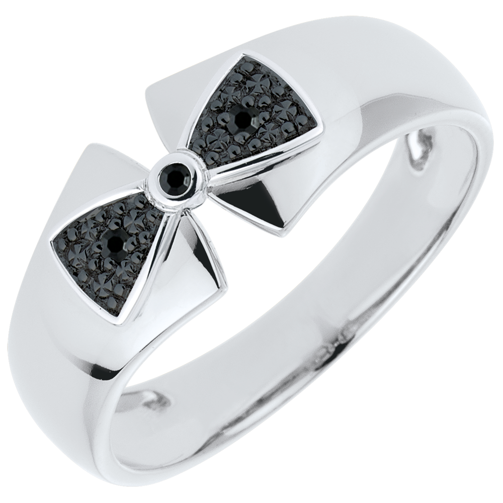 O panglică de aur alb închisă de un nod de aur alb, rodiu negru şi diamante negre pentru a înconjura degetul dumneavoastră.