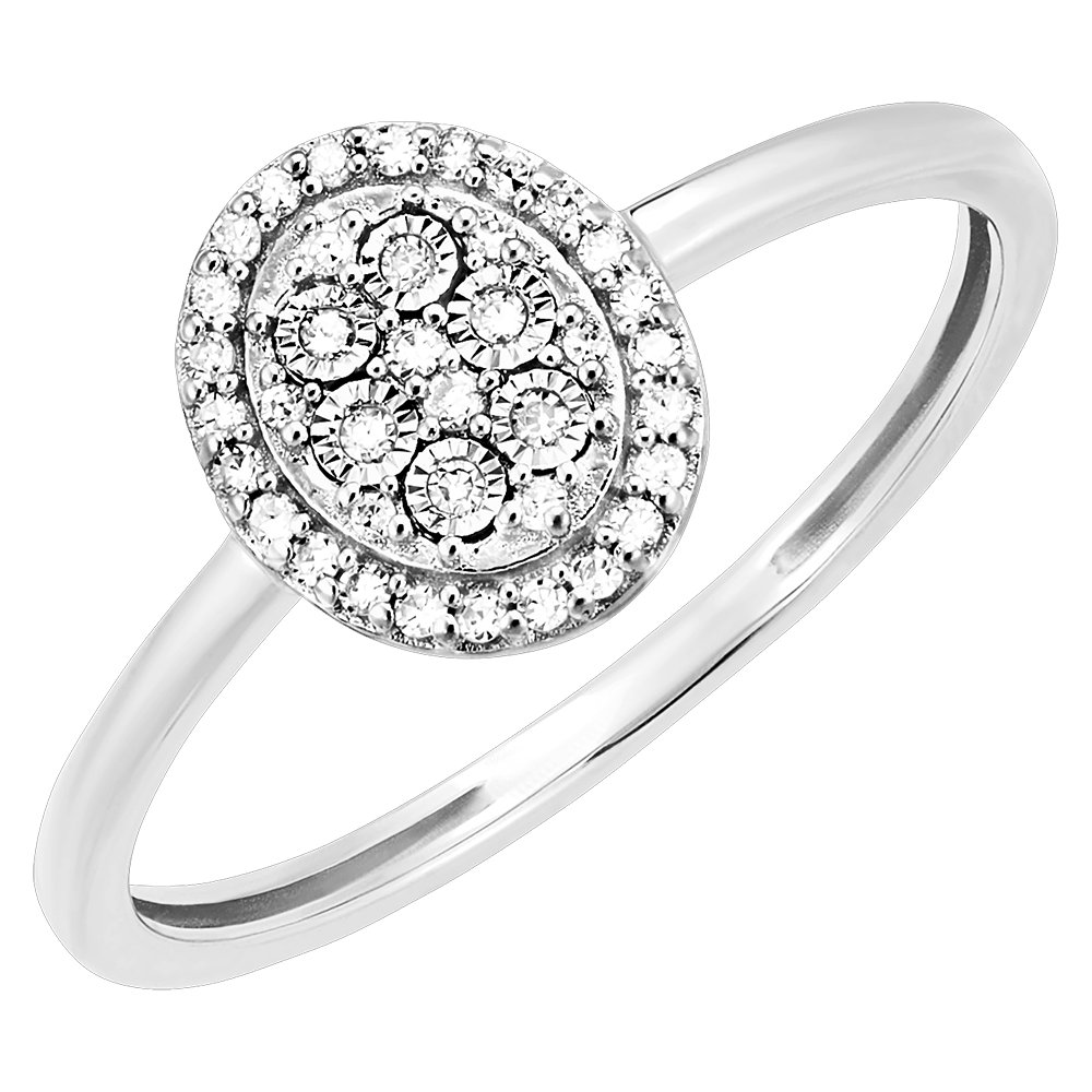 Strălucirea unui pavaj oval de diamante, încoronat de un diamant halo și fixat în mod delicat pe un inel de aur alb. Un inel din aur alb fin și subtil, amprenta unei eleganțe atemporale.