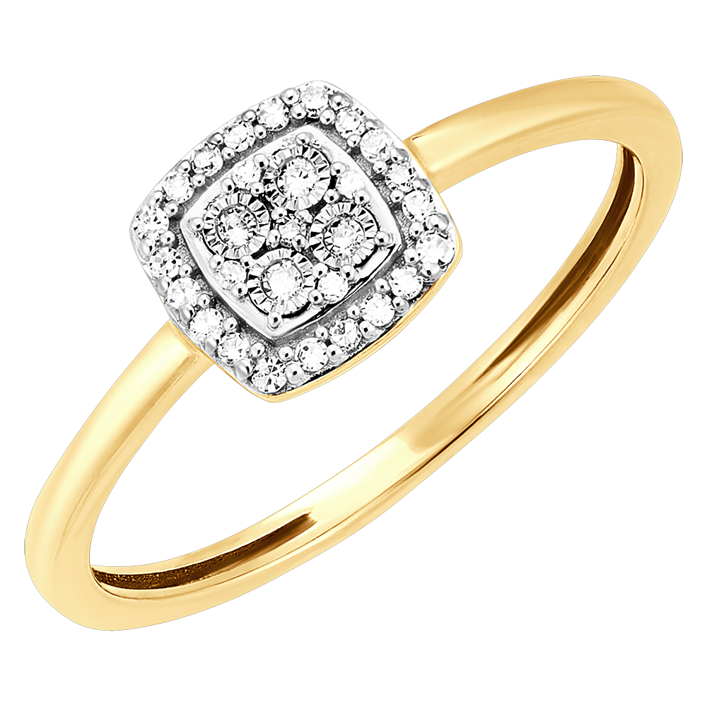 Strălucirea unui pavaj pătrat de diamante, încoronat de un diamant halo, fixat în mod delicat pe un inel din aur galben. Un inel din aur alb și aur galben, fin și subtil, amprenta unei eleganțe atemporale.